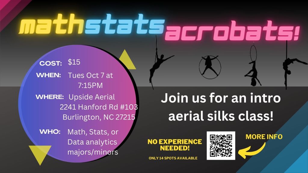 Elon Students, to sign up for the event, go to this form. To pay the $15 fee, go see MaryLee Tyndall, the Math and Stats program assistant, in Duke 209. Please bring $15 in cash. If you would prefer to pay with venmo, talk to Dr. Nancy Scherich.